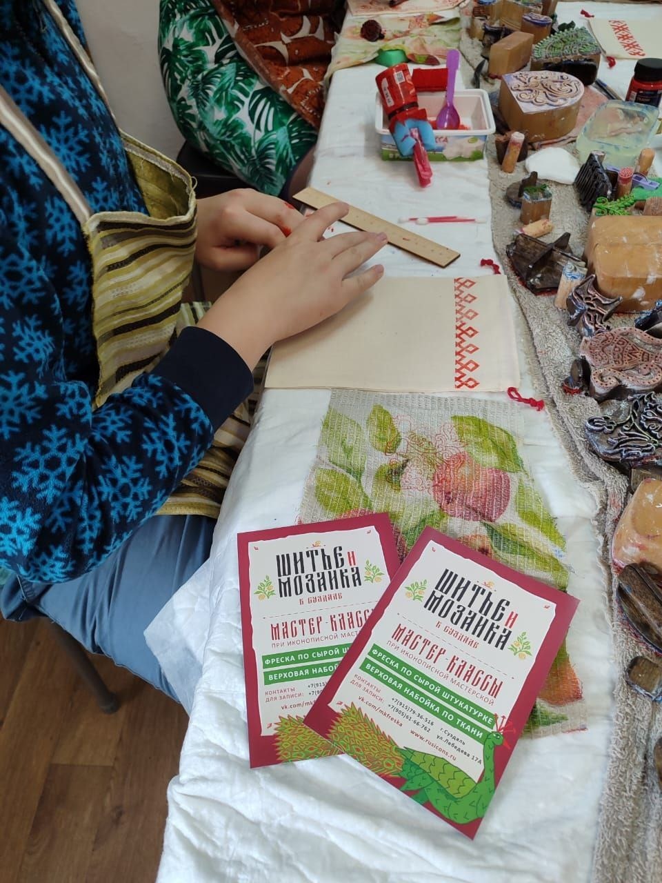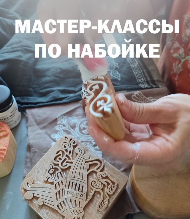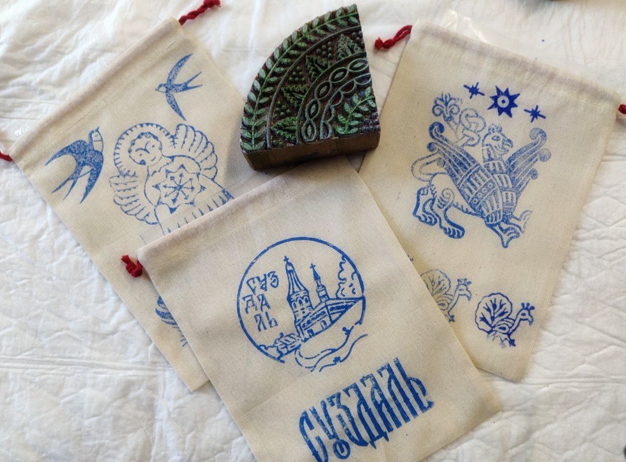 Мы будем работать уникальными цвéтками (резные деревянные штампы) с различными рисунками. В том числе разработанными нашим художником на основе древних орнаментов Владимиро-Суздальской земли (каменная резьба, фресковая роспись, резные наличники, образцы исторических тканей).