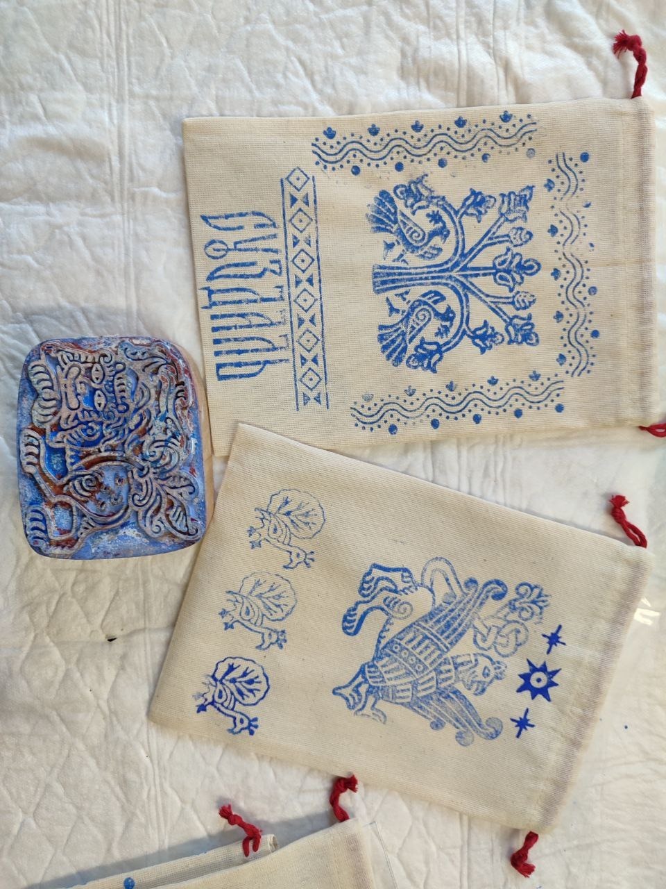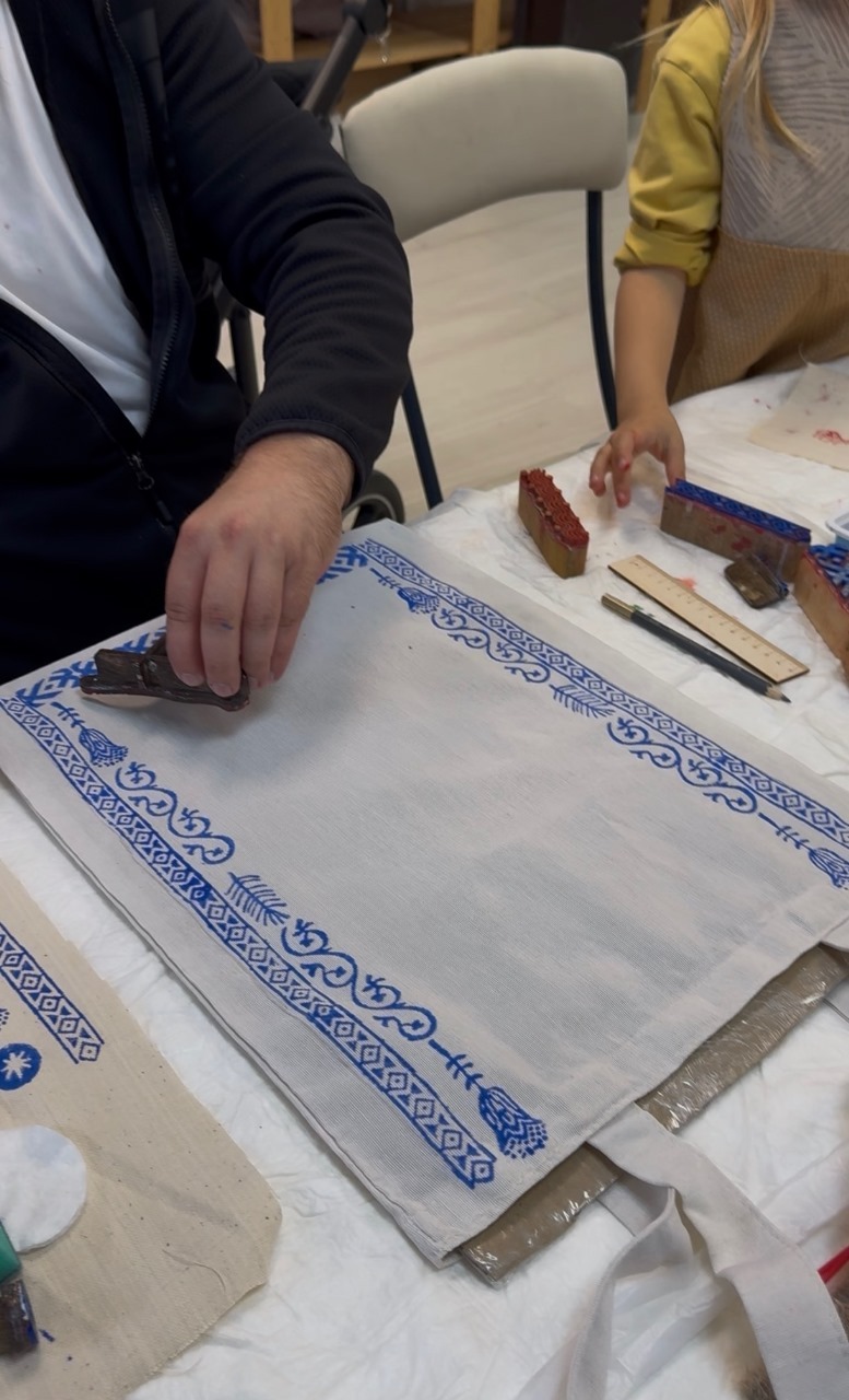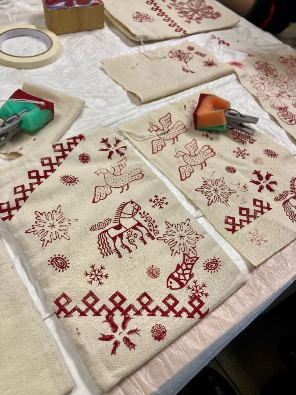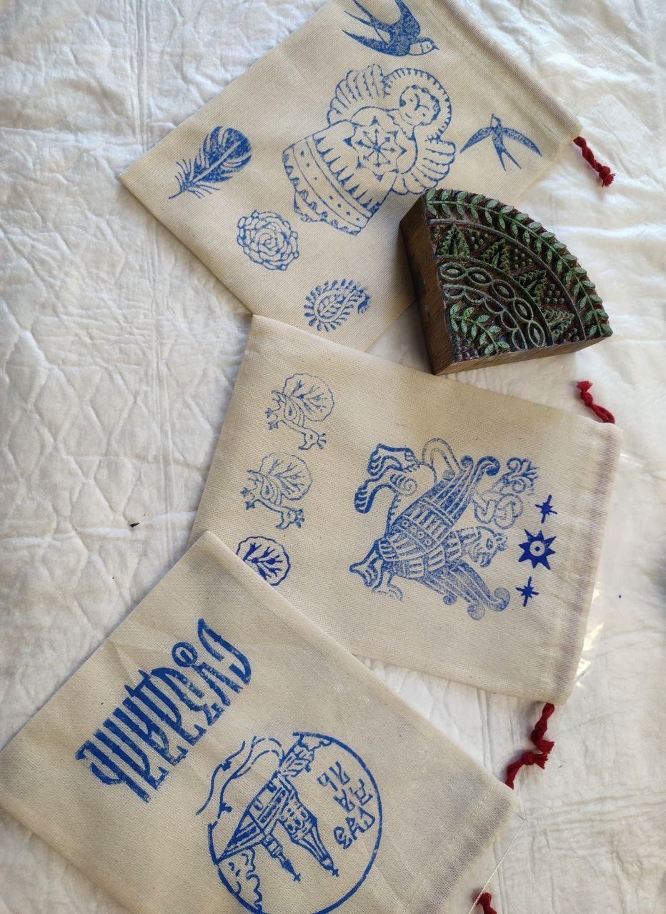 Из этих орнаментов участники собирают свои индивидуальные рисунки на двух хлопковых мешочках либо на шоппере. Готовые мешочки/ шоппер можно сразу забрать с собой.