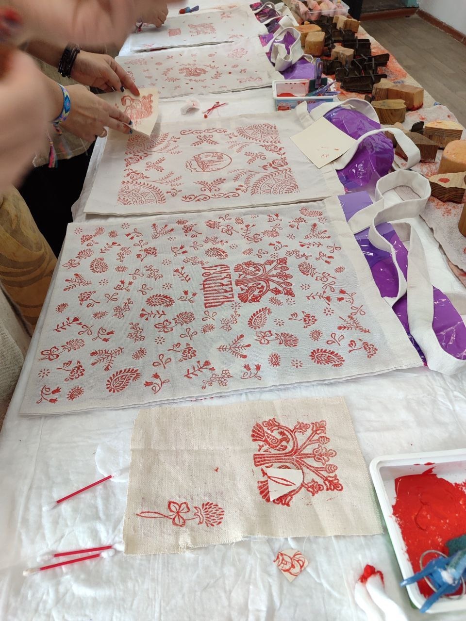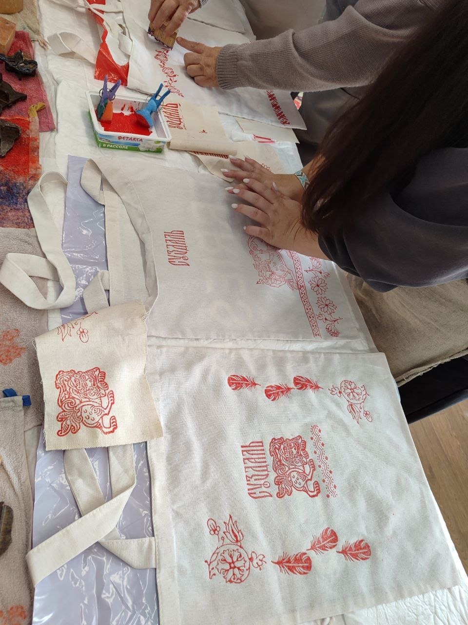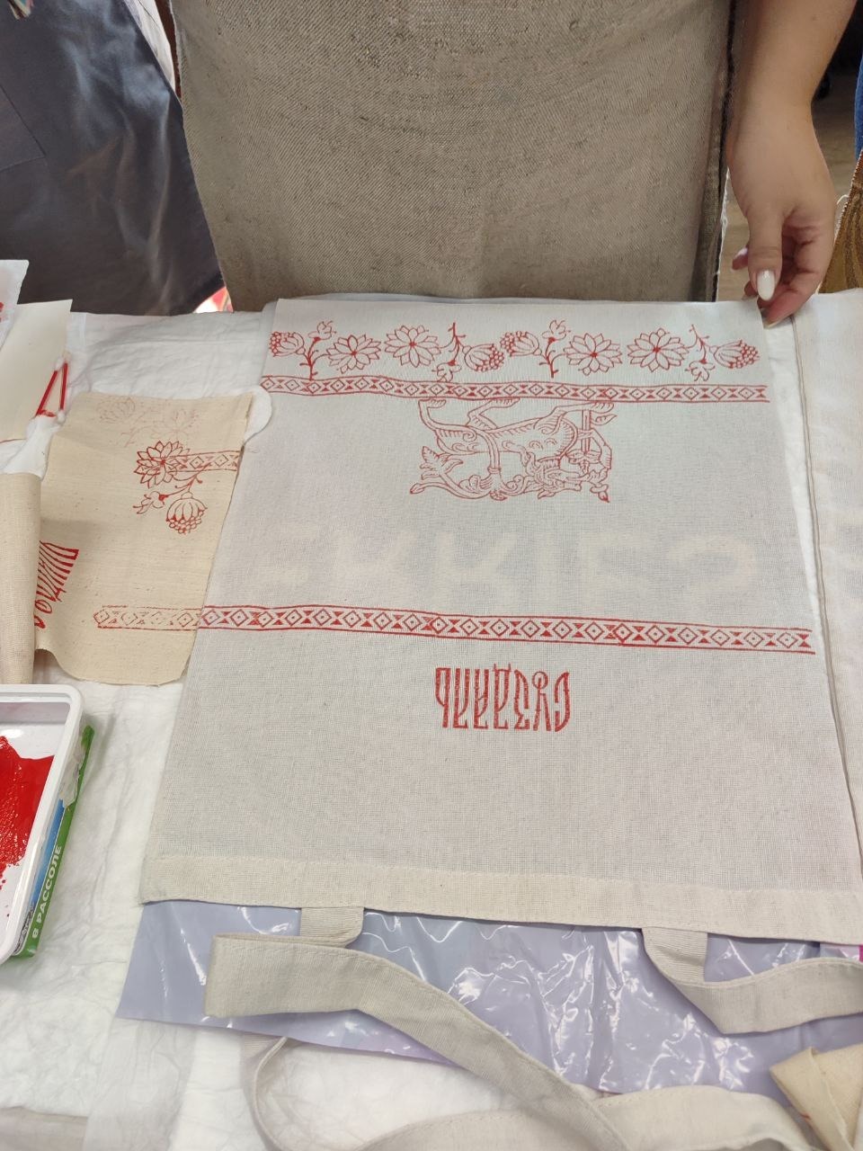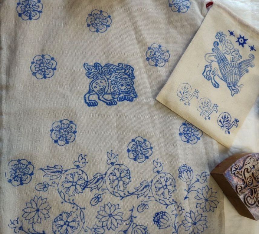 На мастер-классе вы украшаете мешочки из хлопка либо шоппер методом верховой набойки.